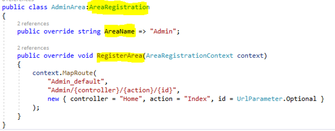 Root class of each module/Area is inherited from AreaRegistration.cs. AreaRegistration class provided by MVC framework to register Area in MVC application.
